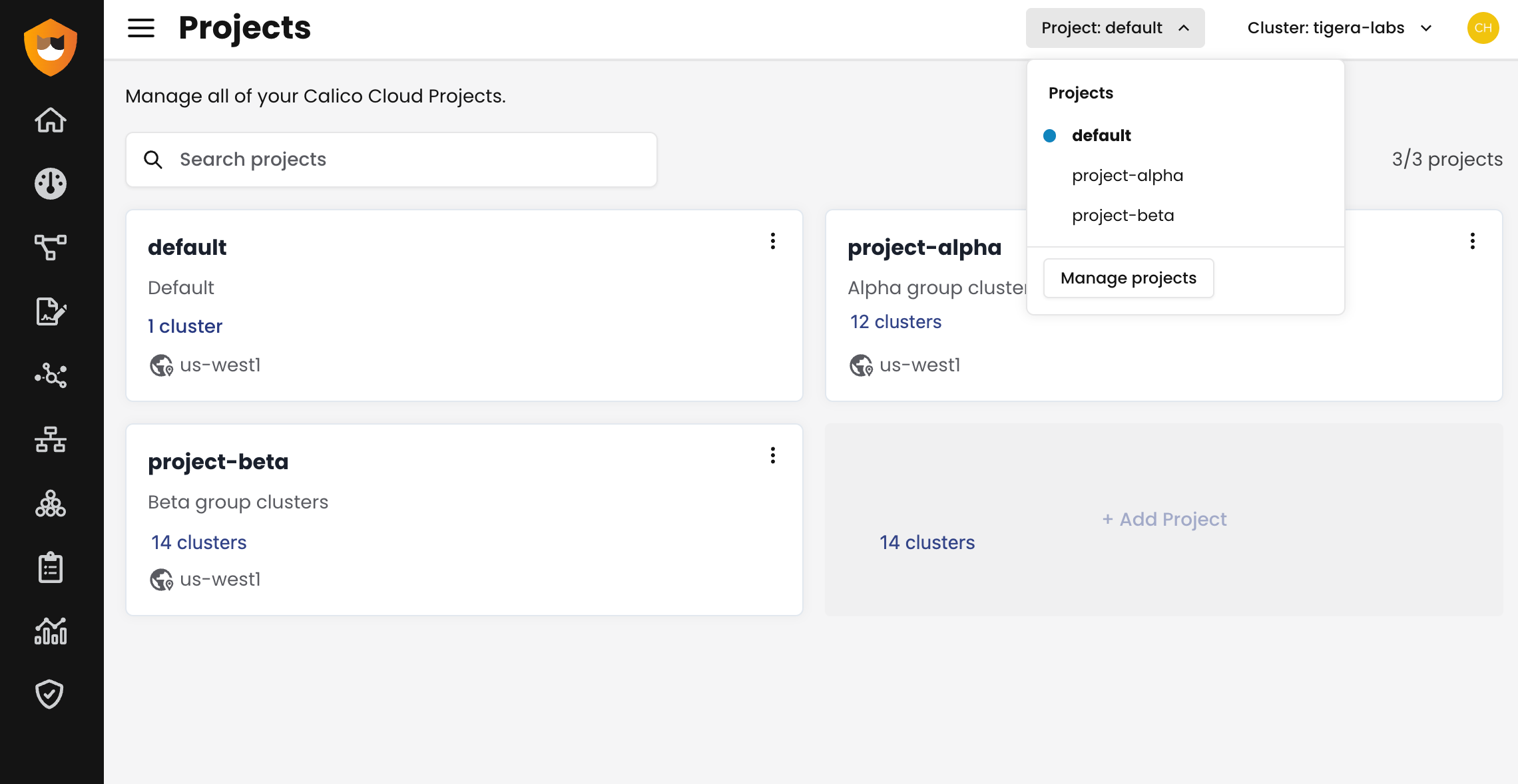 All Calico Cloud organizations start with a single default project. You can have up to three projects at a given time.